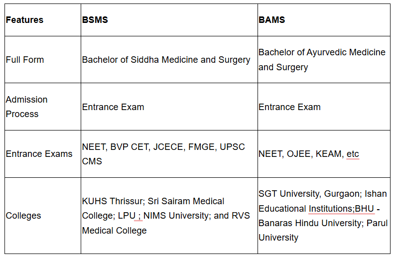 A common confusion among aspirants is BAMS vs BSMS. While BAMS (Bachelor of Ayurvedic Medicine and Surgery) focuses on Ayurveda, Bachelor of Siddha Medicine and Surgery focuses on Siddha, primarily practiced in South India.