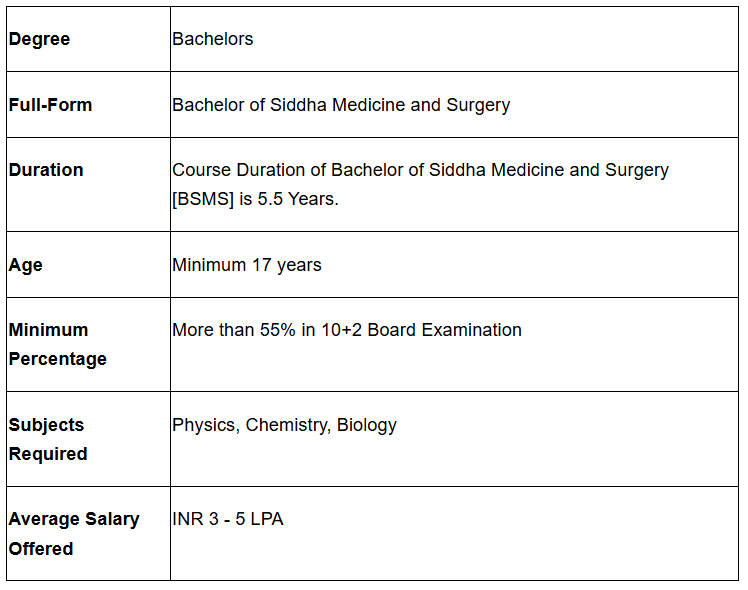 BSMS is an abbreviation of Bachelor of Siddha Medicine and Surgery. It is a UG degree under the AYUSH system of medicine, which is regulated by the National Commission for Indian System of Medicine (NCISM). This course trains students in Siddha medicine, which is among one of the oldest Indian traditional medical systems and it is believed to have been developed by ancient Siddhars.