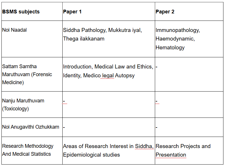 The BSMS curriculum is well structured to balance between the traditional and modern subjects. The Bachelor of Siddha medicine and Surgery course covers classical siddha literature, Gunapadam (pharmacology), Noi Nadal (pathology and diagnosis) and Maruthuvam (general medicine).