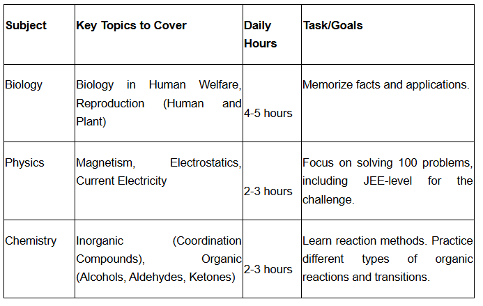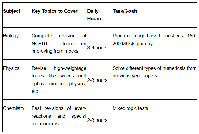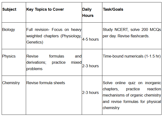 Make certain that you have time to cover all NEET syllabus in the allocated time and have good time to revise and practice before the actual test.