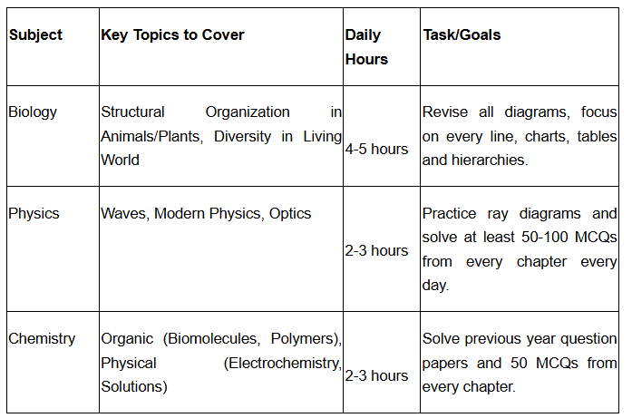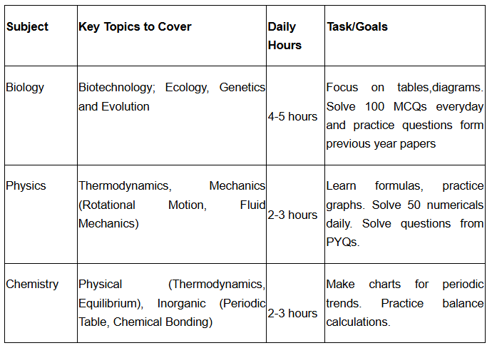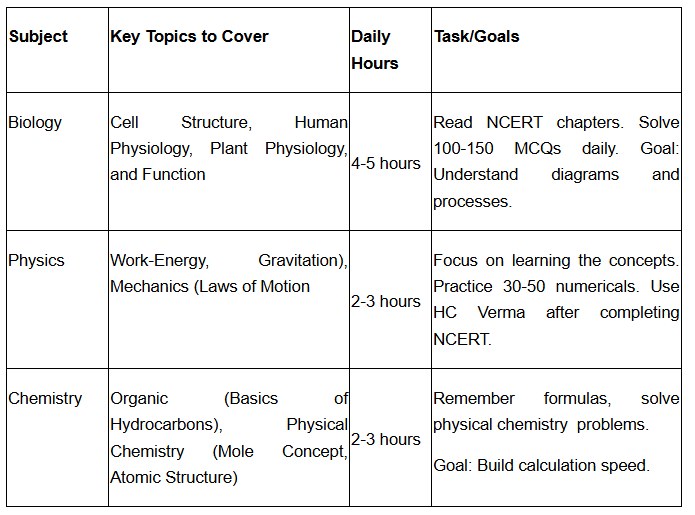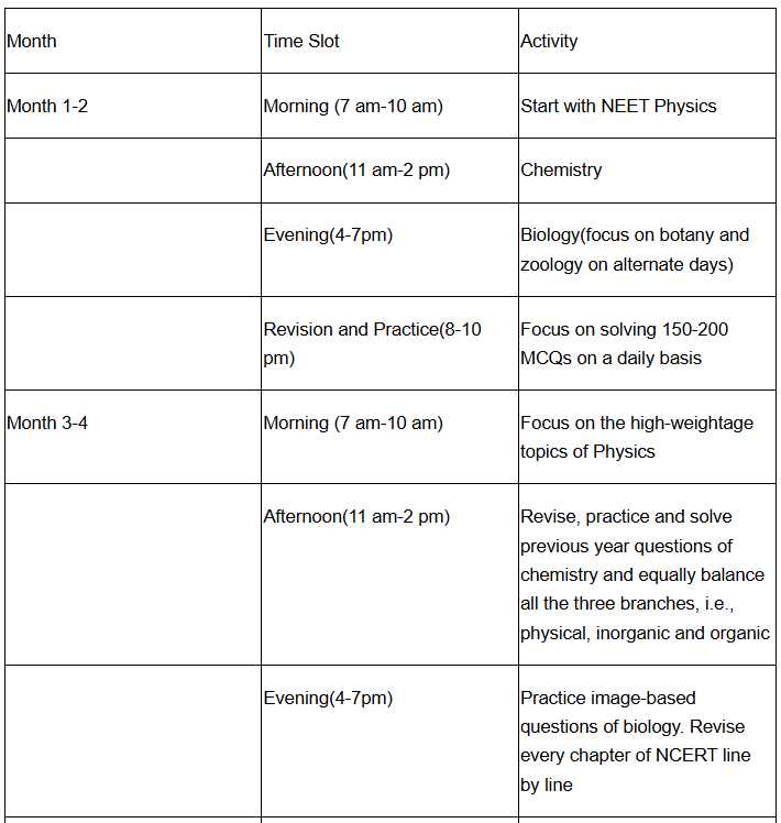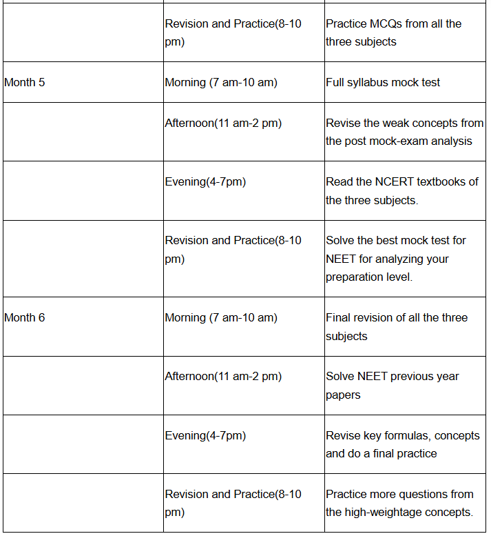 A NEET 6 months plan requires focus, consistency, smart preparation and intelligent planning. Learn the basics of NCERT Biology, Physics, and Chemistry. Break down the months in a strategic manner: the first three months will be used to grasp the concepts and the remaining two months will be spent in intense practice and revision. The last month should be devoted to mock tests, error analysis, and improving speed and accuracy. Develop a practical daily timetable, balancing study, breaks and rest. Avoid distractions, revise and monitor your progress. Six months with good discipline, good time management and the right state of mind is enough to aim for a highest score in NEET. Here is a sample NEET 6 months plan provided for your reference:
