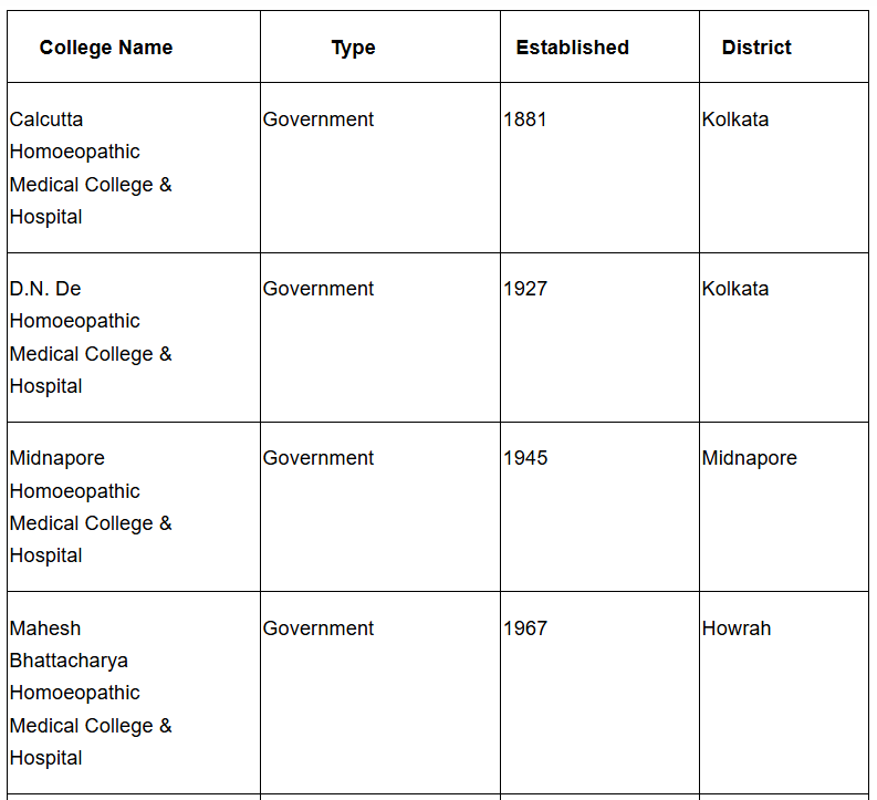 BHMS Govt Colleges in West Bengal