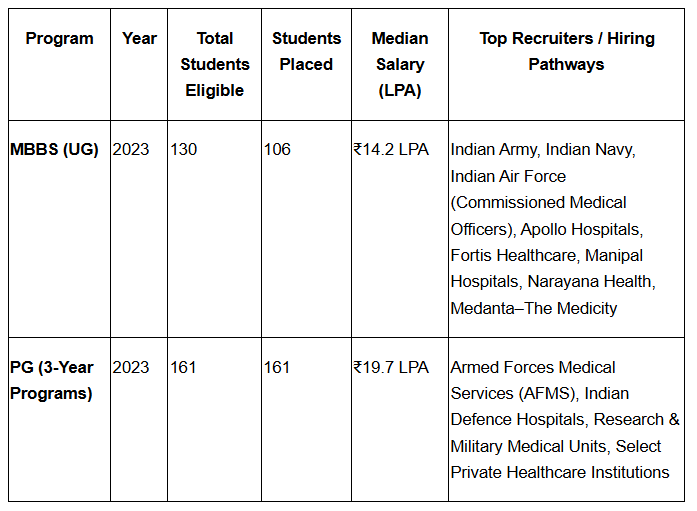 AFMC has a 100% graduate placement sync with the Armed Forces Medical Services (AFMS). The graduates of AFMC are appointed as medical officers in the Indian Army, Navy, and Air Force. The median figure for the year 2023 was ₹14.2 LPA (UG) and ₹19.7 LPA (PG), with the recruiters being AFMS, Apollo Hospitals, Fortis, Manipal, and Medanta, which makes AFMC one of the most rewarding medical colleges in India. AFMC also has several Armed Forces Medical College notable alumni serving in top military medical positions.