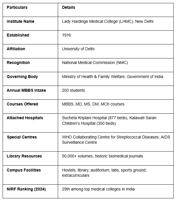 Lady Hardinge Medical College or LHMC is a medical college in India exclusively for women at the undergraduate levels. However, postgraduate and super speciality programs are open to both male and female candidates. It was founded in 1916 and is among the oldest medical colleges of India. It is affiliated with University of Delhi and its campus is in Connaught Place in New Delhi. It has ranked 20th in the Medical category based on the 2025 rankings. LHMC Delhi provides approximately 25+ Courses at UG, PG, and Super Specialty levels.