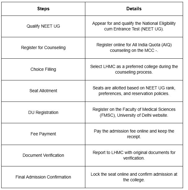 Lady Hardinge Delhi Hospital application window typically opens around March-April. Aspirants seeking admission to the MBBS programme at the institute must pass the NEET UG entrance exam. The future candidates have to be aware of their LHMS New Delhi and apply accordingly. To apply to the Delhi Lady Hardinge Medical College MBBS programme, follow the steps below: