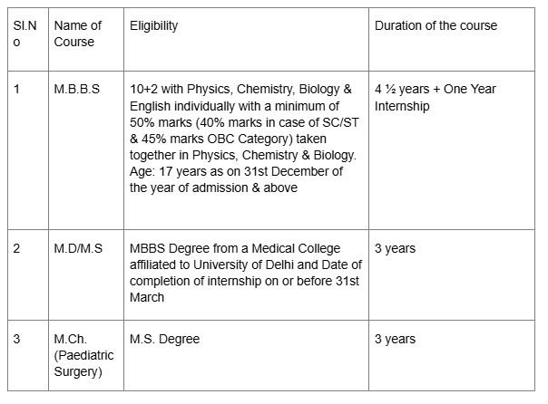 LHMC provides 200 Seats for MBBS every year and 77% of the MBBS seats are allocated to the students of Delhi. The remaining seats are filled on an All-India basis. The college has two full-fledged hospitals namely Smt. Sucheta Kriplani Hospital and Kalawati Saran Child Hospital where the students of the college can get the practical training.