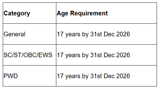 - Candidates must have completed 17 years at the time of admission or will complete the age on or before 31st December 2026.
