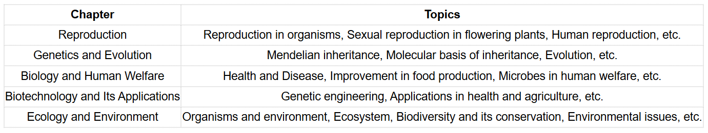 - Building on Class 11 concepts, the Class 12 syllabus delves deeper into advanced topics, including human reproduction, evolution, ecology, biotechnology, and genetics.