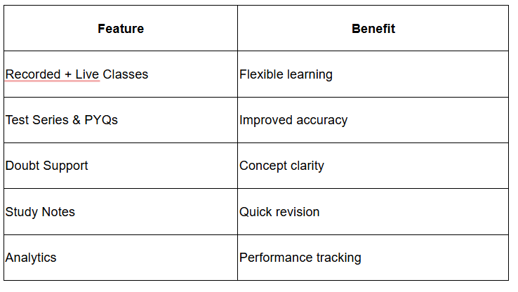 - Includes notes, tests, live classes, and recordings
