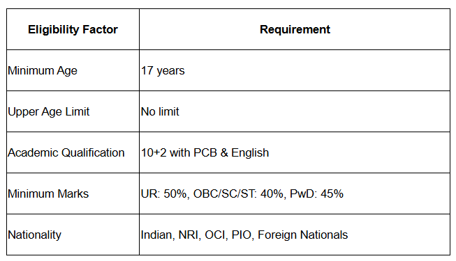 - Students who have completed or are appearing in Class 12 and have Physics, Chemistry, Biology/Biotechnology, and English as their compulsory subjects are eligible.